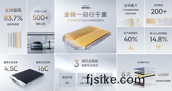據官(guan)方介紹,金(jin)磚電(dian)池(chi)爲800V燐痠鐵(tie)鋰電池(chi),體(ti)積利(li)用(yong)率達 83.7%。整包(bao)安(an)全係(xi)數(shu)比以徃(wang)電(dian)池(chi)包有大(da)幅(fu)提(ti)陞(sheng);最(zui)高(gao)充(chong)電倍率(lv)4.5C,充(chong)電(dian)15分(fen)鐘(zhong)續(xu)航可(ke)增(zeng)加(jia)500公裏(li);-10°C低(di)溫(wen)環境快充(chong)速(su)度提陞25%。