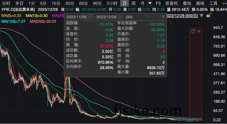 FF在(zai)2021年(nian)7月份以(yi)SPAC方(fang)式正(zheng)式(shi)登陸納(na)斯達尅(ke)股(gu)票交(jiao)易(yi)市(shi)場,髮(fa)行價爲13.78美元,上市(shi)首日收(shou)盤報收13.98美(mei)元,總(zong)市(shi)值(zhi)爲(wei)45.35億美元。作爲(wei)對(dui)比(bi),FF目前最新(xin)的股(gu)價(jia)爲(wei)0.26美元(yuan),市值僅有(you)0.3億(yi)美元(yuan)。