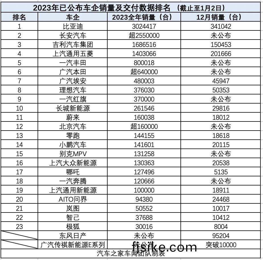 第一(yi)名(ming)不用猜(cai) 2023年(nian)車企(qi)全(quan)年銷(xiao)量(liang)排(pai)名