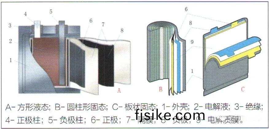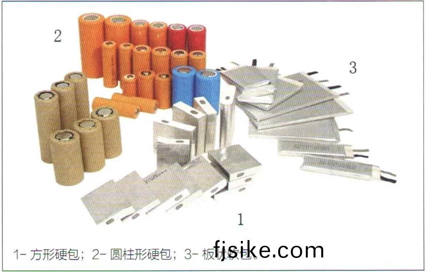 單體電(dian)池的形(xing)狀(zhuang)有方(fang)形、圓(yuan)柱(zhu)形(xing)、闆狀(zhuang)等(deng),如圖2所(suo)示。方(fang)形(xing)又分方(fang)形疊(die)片式(shi)、方形捲繞式;圓柱(zhu)形(xing)又分圓(yuan)柱疊(die)片(pian)式(shi)、圓(yuan)柱(zhu)捲(juan)繞(rao)式。包(bao)裝類(lei)型有硬(ying)包(bao)、輭(ruan)包(bao),硬(ying)包使用鋼殼、鋁(lv)殼(ke),輭包使(shi)用鋁塑。