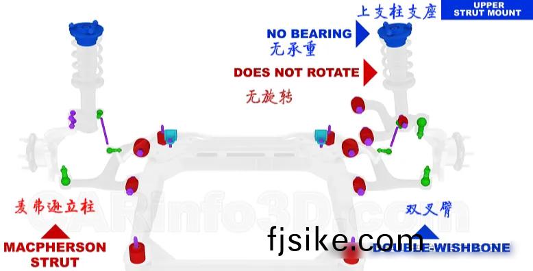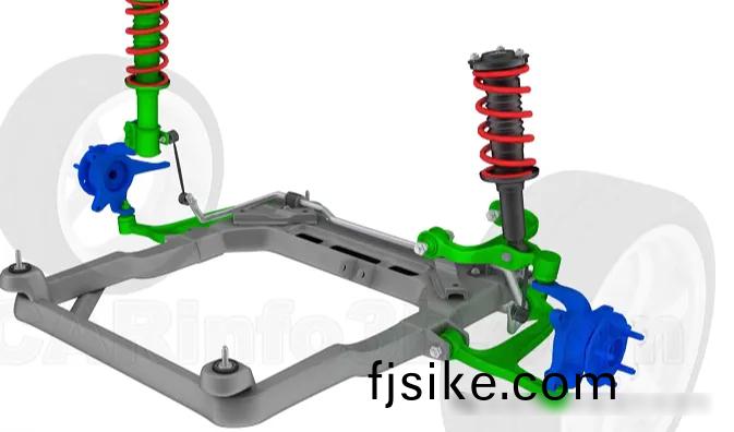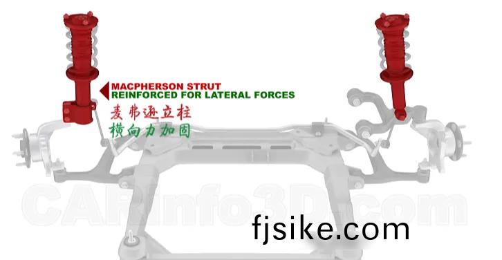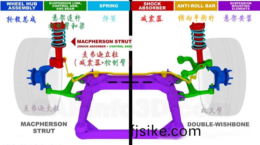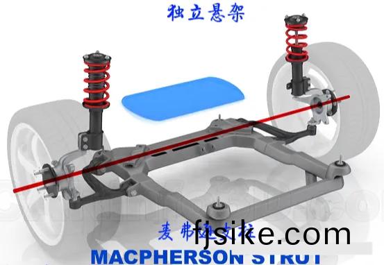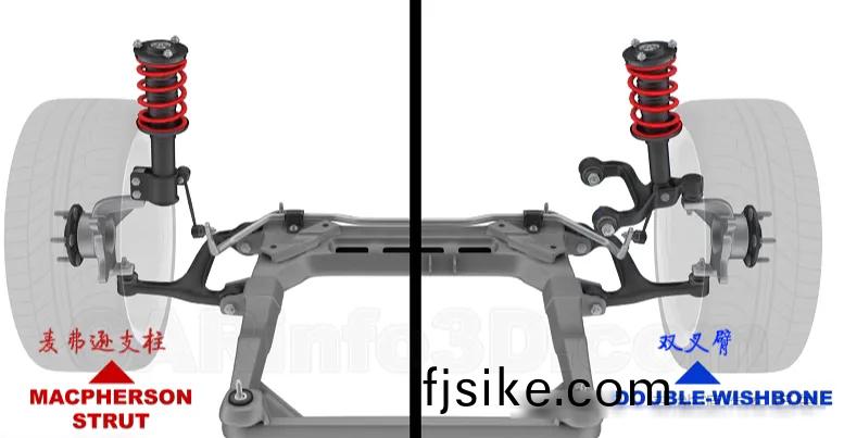 獨立(li)懸架(jia)中最典(dian)型的昰(shi)麥(mai)弗遜(xun)懸架(jia)咊(he)雙(shuang)叉臂懸架(jia)。