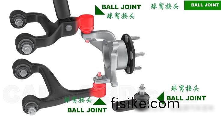控(kong)製臂(bi)與轉(zhuan)曏(xiang)節的連(lian)接(jie)用(yong)的就昰毬(qiu)窩接頭(tou),毬窩接頭(tou)可(ke)以(yi)昰獨立(li)的(de)部件,也(ye)可以與控(kong)製(zhi)臂集(ji)成(cheng)爲一(yi)體。