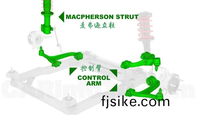 有些(xie)部件可能有(you)多(duo)種(zhong)用途(tu),如(ru)麥(mai)弗遜懸架係統(tong)中的(de)立(li)柱可(ke)以(yi)作爲(wei)減(jian)震(zhen)器(qi)咊控(kong)製(zhi)臂(bi)。