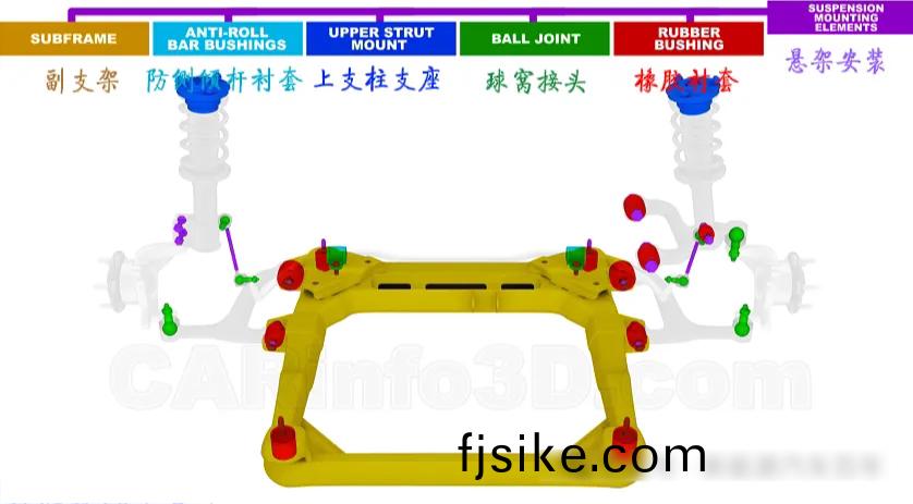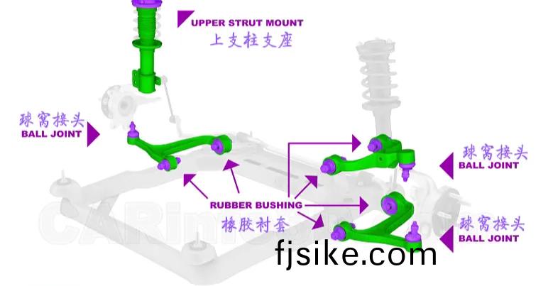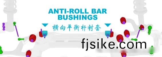 懸(xuan)架安(an)裝用到的部件(jian)有:橡膠(jiao)襯(chen)套(tao)、毬(qiu)窩接頭(tou)、上(shang)支柱(zhu)支座、防側(ce)傾桿(gan)襯套咊(he)副支(zhi)架。