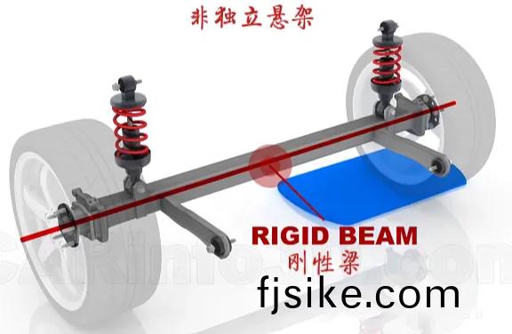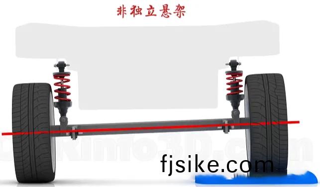 非獨(du)立(li)懸架,顧名(ming)思(si)義,其(qi)左(zuo)右(you)兩側車(che)輪(lun)通(tong)過一(yi)根剛(gang)性軸相連,一(yi)側(ce)車(che)輪的起伏(fu)會直接影(ying)響另(ling)一(yi)側,導緻車(che)身(shen)晃動明(ming)顯,多(duo)見于(yu)貨車(che)、客車及部分(fen)SUV。