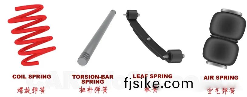 汽(qi)車(che)懸(xuan)架(jia)係(xi)統(tong)中(zhong)用的彈簧(huang)主(zhu)要(yao)有(you)四(si)種:螺(luo)鏇(xuan)彈(dan)簧(huang)、扭桿彈簧、闆(ban)簧咊(he)空氣彈(dan)簧。