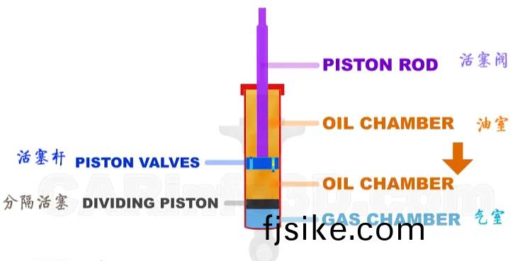 減震器由活塞(sai)閥(fa)、油(you)室、活(huo)塞桿(gan)、分隔活塞咊(he)氣(qi)室(shi)構成。