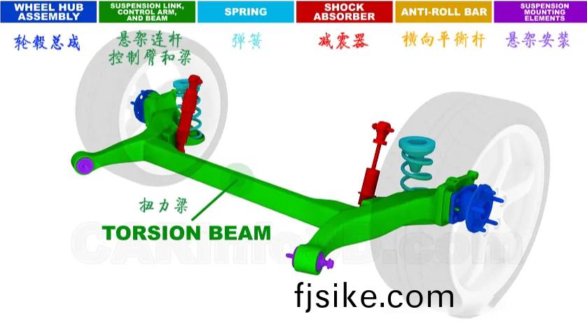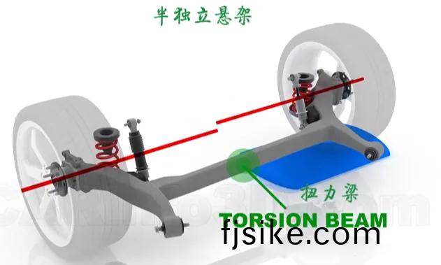 在(zai)半(ban)獨立懸架(jia)係(xi)統中,傳(chuan)遞(di)力(li)的(de)部(bu)件則主要昰(shi)扭(niu)力樑(liang)。