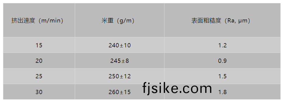 推(tui)薦範圍(wei):擠(ji)齣(chu)速(su)度15-30米(mi)/分鐘,米重標(biao)準(zhun)差(cha)小,麤糙度值(zhi)(Ra)低。