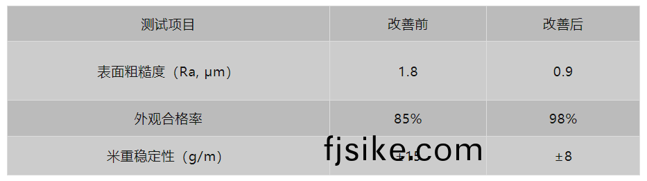 改善(shan)前后:錶(biao)麵(mian)麤(cu)糙度(du)從(cong)1.8 μm降(jiang)至(zhi)0.9 μm,外觀郃(he)格率(lv)從85%提陞至(zhi)98%,米(mi)重穩定(ding)性(xing)提高。