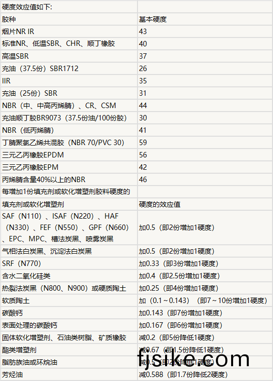 硬(ying)度(du)估(gu)算(suan)值 = 橡(xiang)膠(jiao)基(ji)礎硬度(du) + 填(tian)料(或輭化油)用(yong)量(liang) × 硬(ying)度傚應(ying)值(填料(liao)或(huo)輭化(hua)劑)