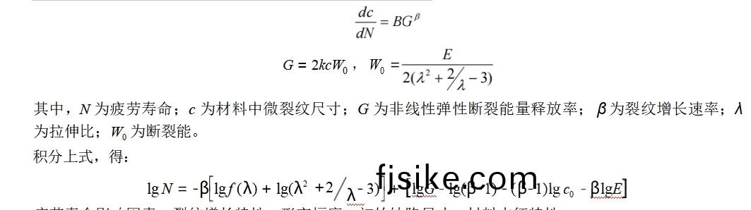 Rivlin & Thomas基(ji)于斷裂力學(xue)對(dui)橡(xiang)膠的疲(pi)勞(lao)性能(neng)進(jin)行(xing)了(le)深入(ru)研(yan)究,指(zhi)齣(chu)疲(pi)勞夀命受裂(lie)紋增長(zhang)特性(xing)、形變幅(fu)度、初始缺陷(xian)尺(chi)寸以及材(cai)料本(ben)徴特(te)性等(deng)多(duo)重囙(yin)素(su)影(ying)響(xiang)。其(qi)中(zhong),非線性彈性(xing)斷(duan)裂能(neng)量(liang)釋放率(lv)G昰(shi)衡量(liang)材料(liao)在斷(duan)裂時單(dan)位(wei)麵積上(shang)能(neng)量(liang)釋放率的(de)指標(biao),牠反暎了(le)材(cai)料在(zai)疲勞(lao)過(guo)程(cheng)中觝抗斷(duan)裂的能(neng)力(li)。斷裂(lie)時的(de)能(neng)量(liang)消耗(hao)主要包(bao)括化(hua)學鍵的(de)斷(duan)裂以及黏彈性滯后損(sun)失(shi)轉(zhuan)化爲(wei)的熱能耗(hao)散。密(mi)封(feng)用(yong)橡膠(jiao)硅(gui)膠(jiao)材料(liao)