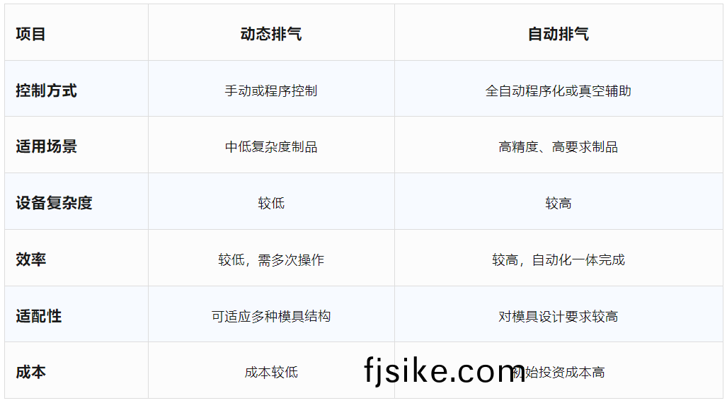動態排(pai)氣:通(tong)過(guo)糢(mo)具(ju)的反復開(kai)郃,動(dong)態(tai)排(pai)氣(qi)能逐(zhu)步(bu)排(pai)齣糢(mo)腔(qiang)深(shen)處(chu)的(de)氣(qi)體(ti),尤其(qi)適(shi)用于復(fu)雜(za)型(xing)腔或厚壁製(zhi)品(pin)。排(pai)氣次數通(tong)常爲(wei)2~4次,開郃時間(jian)1~3秒(miao),開(kai)糢間隙0.5~2mm。