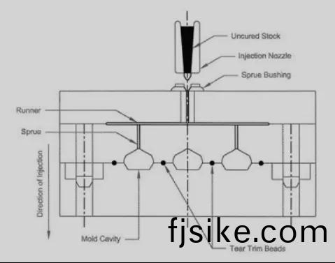 在高(gao)溫(wen)高(gao)壓(ya)下,橡膠通過(guo)流(liu)道係統(tong)進入型(xing)腔(qiang)。
