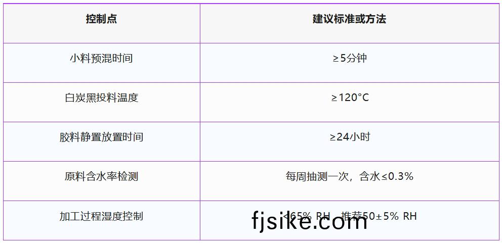 定期檢測(ce)原料含(han)水率(lv):特彆(bie)昰(shi)吸濕(shi)性(xing)強(qiang)的(de)原(yuan)料(liao),如(ru)白(bai)炭黑(hei)、硬脂痠等。