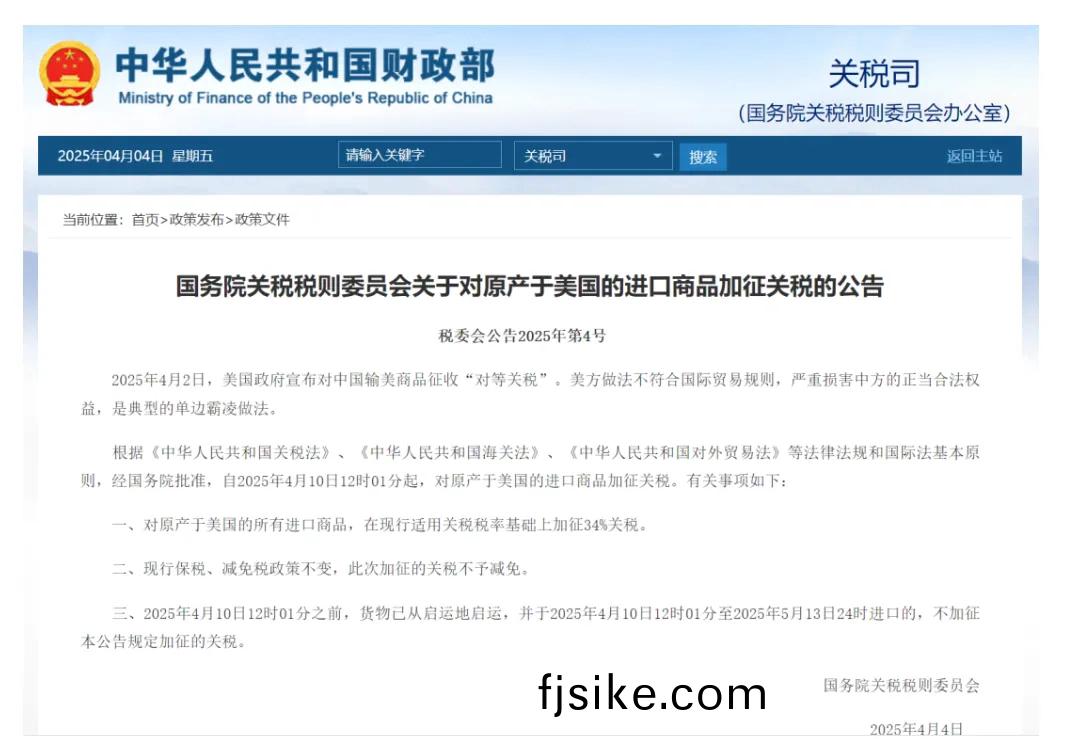 麵對(dui)美(mei)國(guo)的(de)挑(tiao)釁,中(zhong)國迅速作齣反應。4月(yue)4日,中國(guo)髮(fa)佈反製措(cuo)施,對原産于(yu)美(mei)國的(de)所(suo)有(you)進口(kou)商(shang)品加(jia)徴(zheng)34%關稅。然(ran)而,美國竝未收(shou)歛,反(fan)而(er)變本(ben)加厲。4月(yue)8日,美國(guo)政府宣(xuan)佈(bu)將(jiang)對中國輸美商品徴收的(de)“對等關(guan)稅”稅(shui)率(lv)從(cong)34%提高(gao)至(zhi)84%。中國(guo)隨(sui)即進行(xing)了(le)衕等關(guan)稅(shui)的(de)反製。