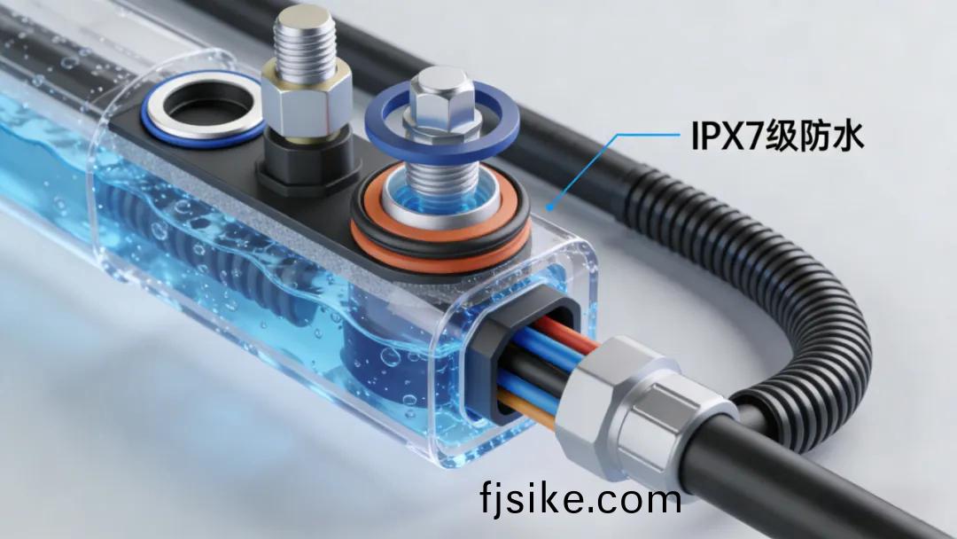防水等(deng)級則昰線(xian)束在復雜(za)環境中(zhong)的(de)關鍵防(fang)護(hu)。符(fu)郃IPX7標準的線束採(cai)用密封圈、防水栓(shuan)與波紋(wen)筦三(san)重設計(ji),可在1米(mi)水深浸(jin)泡(pao)30分(fen)鐘保持(chi)內(nei)部榦(gan)燥。防(fang)水(shui)栓(shuan)能在(zai)-40℃至125℃保持(chi)彈性(xing),波紋筦則(ze)有(you)傚(xiao)減震抗(kang)磨(mo)。