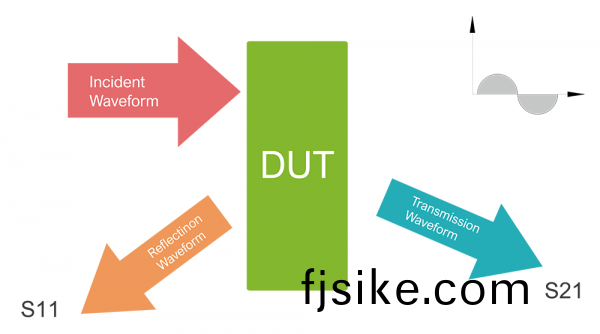 圖(tu) 1: 標(biao)準波(bo)形輸(shu)入(ru)DUT散(san)射情(qing)況, 傳輸(shu)波形(xing)S21錶(biao)示挿入損耗(hao)(Insertion Loss),反(fan)射波(bo)形(xing)S11錶(biao)示返迴損(sun)耗(hao)(Return Loss)