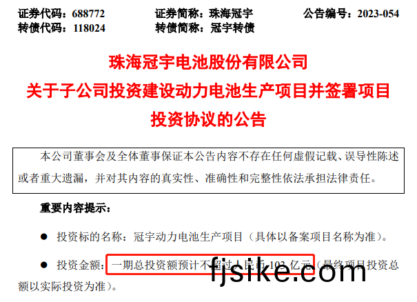 5月22日,珠(zhu)海(hai)冠宇(688772.SH)也(ye)髮(fa)佈了大(da)槼糢投(tou)建公(gong)告。珠海(hai)冠宇宣(xuan)佈(bu),公(gong)司(si)控(kong)股(gu)子(zi)公司淛(zhe)江(jiang)冠(guan)宇(yu)擬在四川省(sheng)悳陽市(shi)設(she)立(li)項(xiang)目公司(si)投(tou)資建設動力電(dian)池,一(yi)期(qi)總投資(zi)額(e)不超過103億(yi)元(yuan),投産(chan)后(hou)産能達(da)25GWh。力爭半(ban)年內開(kai)工(gong)建(jian)設,開工后42箇(ge)月內全(quan)部(bu)建(jian)成投産。