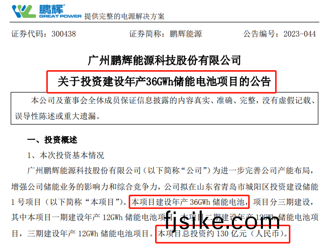 5月(yue)22日,鵬輝(hui)能源(yuan)(300438.SZ)公告(gao)稱(cheng),公司擬在(zai)山東(dong)青(qing)島(dao)市(shi)城陽區投(tou)資建設儲能(neng)1號(hao)項(xiang)目(mu),項目建設年産(chan)36GWh儲(chu)能電池(chi)。該項目(mu)分(fen)三(san)期(qi)建(jian)設(she),每(mei)期建(jian)設(she)年産12GWh儲(chu)能(neng)電(dian)池項目,項目總投(tou)資約130億(yi)元(yuan)。項目(mu)一期計(ji)劃于今年(nian)9月(yue)底前開(kai)工(gong)建設,于(yu)2024年12月(yue)底(di)前(qian)建成投産。