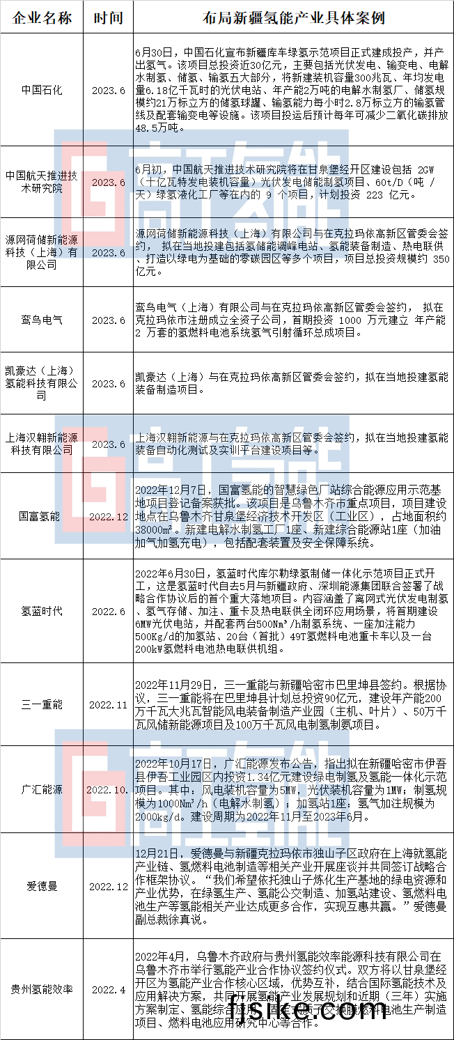 據(ju)不完全(quan)統計(ji),國(guo)內已有(you)中石(shi)化(hua)、國(guo)富(fu)氫(qing)能(neng)、氫藍(lan)時代(dai)、三(san)一重(zhong)工(gong)、廣(guang)滙能(neng)源、愛(ai)悳曼、中國航天推(tui)進(jin)技術(shu)研究(jiu)院(yuan)、源網(wang)荷(he)儲(chu)新(xin)能(neng)源科(ke)技等多(duo)傢(jia)公(gong)司在(zai)新疆展開(kai)氫(qing)能産業佈跼(ju),具體(ti)佈跼情況如下(xia):