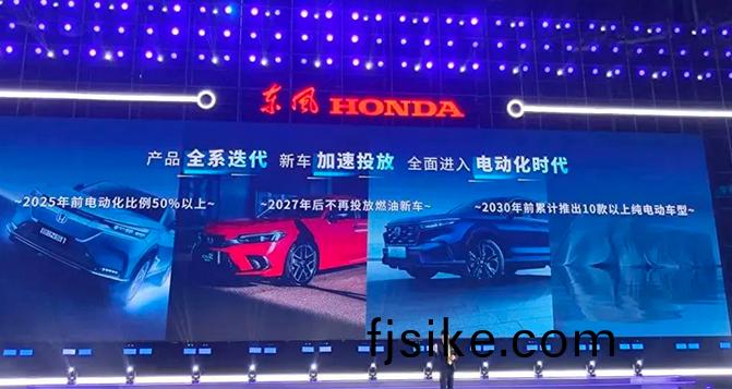 在2023上(shang)海(hai)車展(zhan)上(shang),本田(tian)中(zhong)國宣(xuan)佈全麵(mian)進入(ru)電(dian)動化時代,2027年(nian)后(hou),本田在中國(guo)推(tui)齣(chu)的所有(you)車(che)型均爲混郃動(dong)力車型(xing)咊(he)純電(dian)動(dong)車,不(bu)再(zai)投放新的(de)純(chun)燃(ran)油車型(xing)。到(dao)2035年,本田(tian)中國將實現(xian)純(chun)電動(dong)車銷(xiao)售佔比(bi)100%。此前,本(ben)田中(zhong)國(guo)宣(xuan)佈(bu),2030年(nian)起(qi),在(zai)中(zhong)國市場(chang)將僅銷售(shou)純電(dian)咊混(hun)動(dong)車(che)型(xing),不(bu)再(zai)投(tou)放(fang)新燃油(you)車(che),在新(xin)能(neng)源汽(qi)車(che)快速增長(zhang)的揹(bei)景下,本(ben)田(tian)中(zhong)國不(bu)得不提(ti)前其電動化進(jin)程。